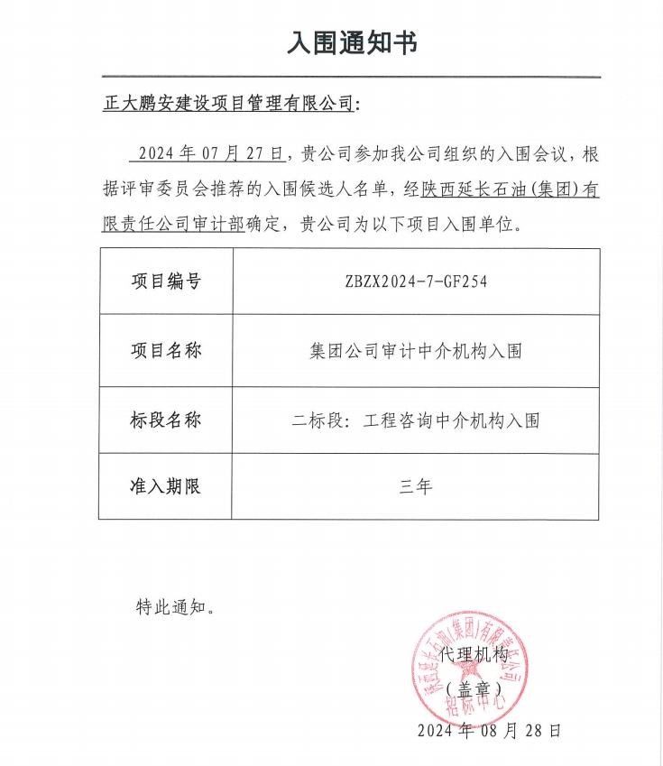 2024年08月28日,經(jīng)評標(biāo)委員會綜合評審,招標(biāo)人確認,正大鵬安建設(shè)項目管理有限公司中標(biāo)“集團公司審計中介機構(gòu)入圍項目”。