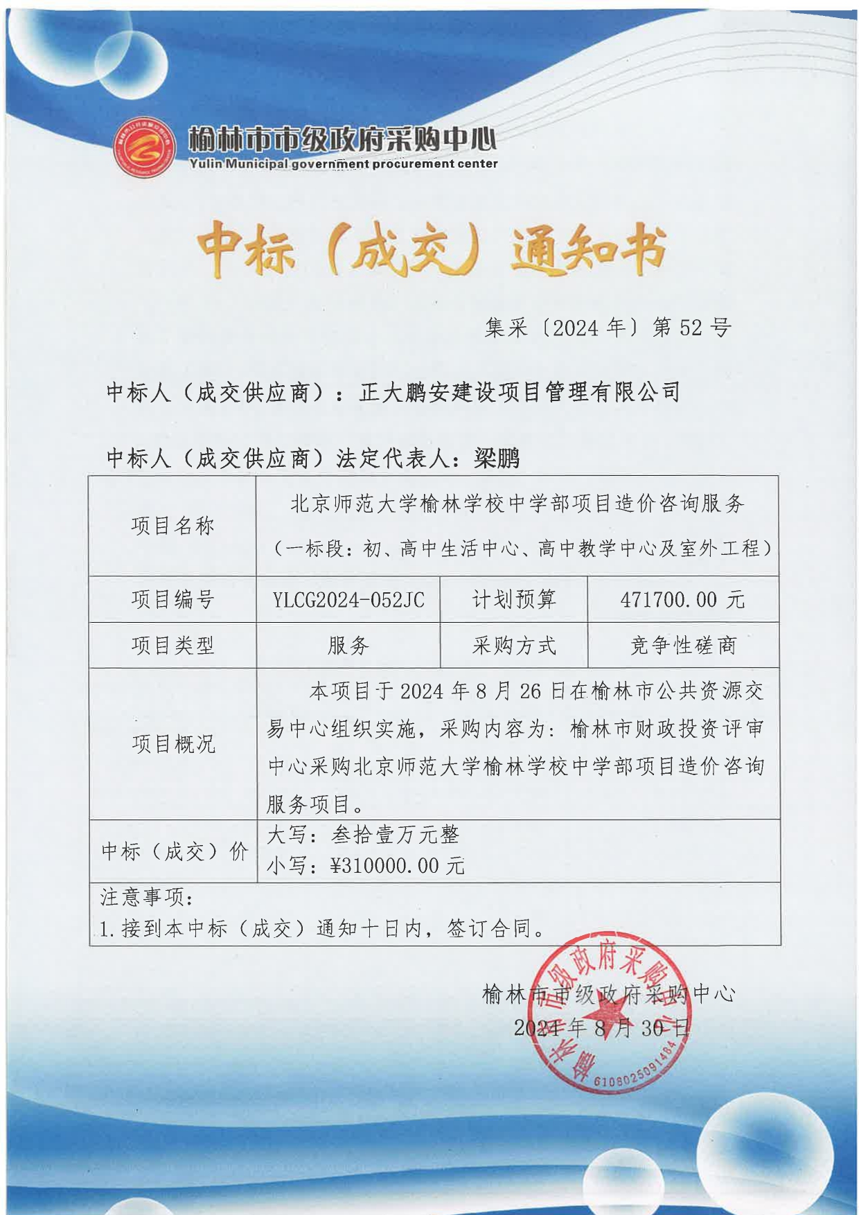 正大鵬安中標(biāo)北京師范大學(xué)榆林學(xué)校中學(xué)部項(xiàng)目造價(jià)咨詢服務(wù)(一標(biāo)段初、高中生活中心、高中教學(xué)中心及室外工程)