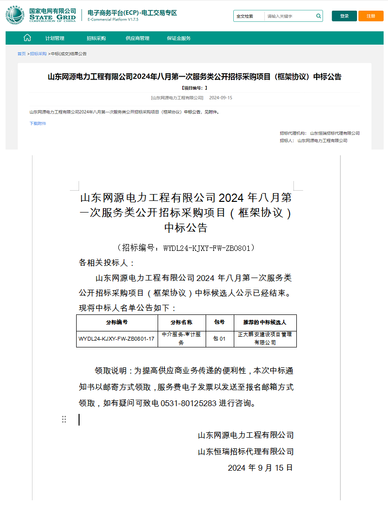 正大鵬安中標(biāo)山東網(wǎng)源電力工程有限公司2024年八月第一次服務(wù)類公開(kāi)招標(biāo)采購(gòu)項(xiàng)目(框架協(xié)議)