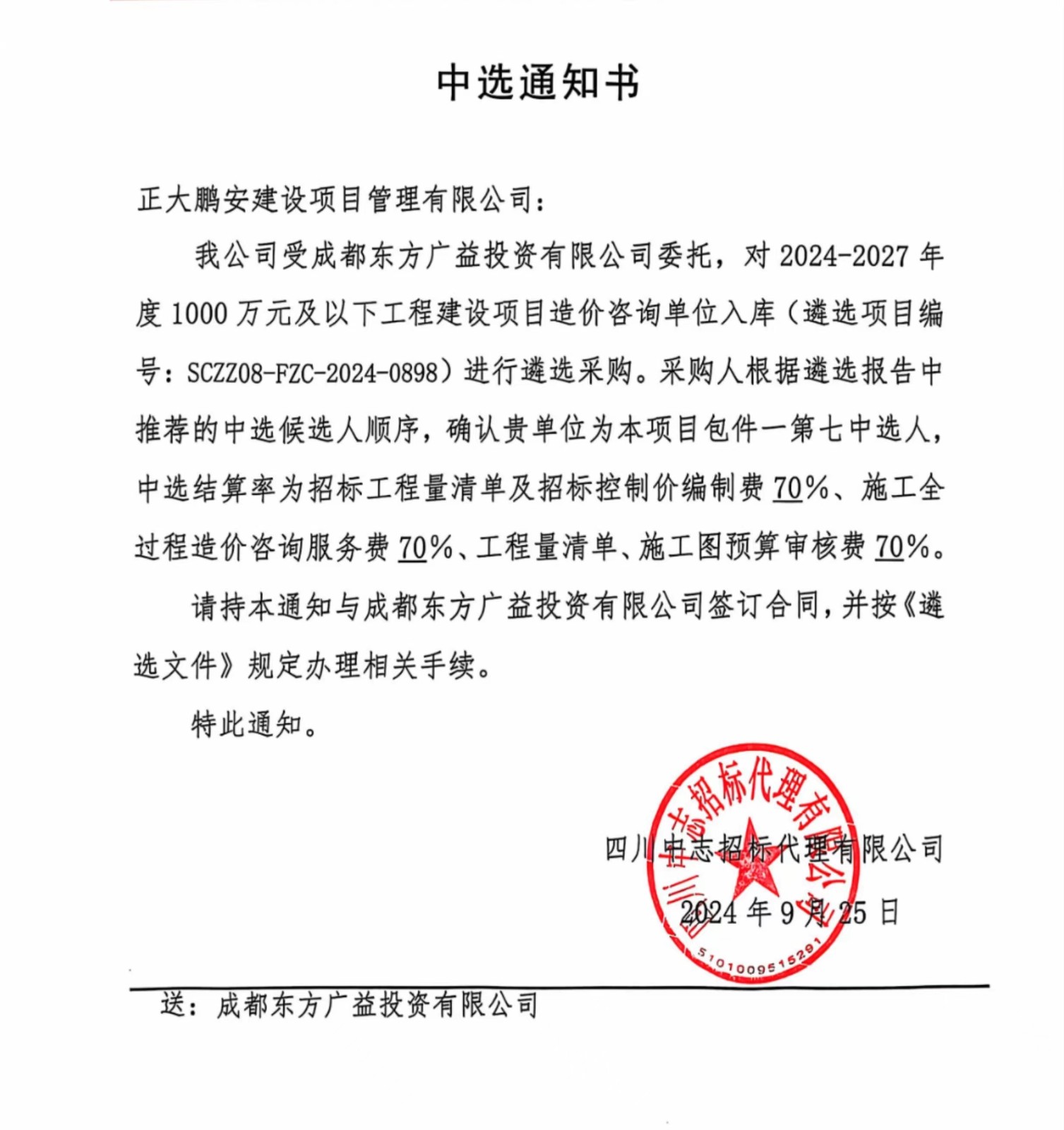 正大鵬安入圍成都東方廣益投資有限公司2024-2027年度1000萬元及以下工程建設(shè)項(xiàng)目造價(jià)咨詢單位入庫項(xiàng)目