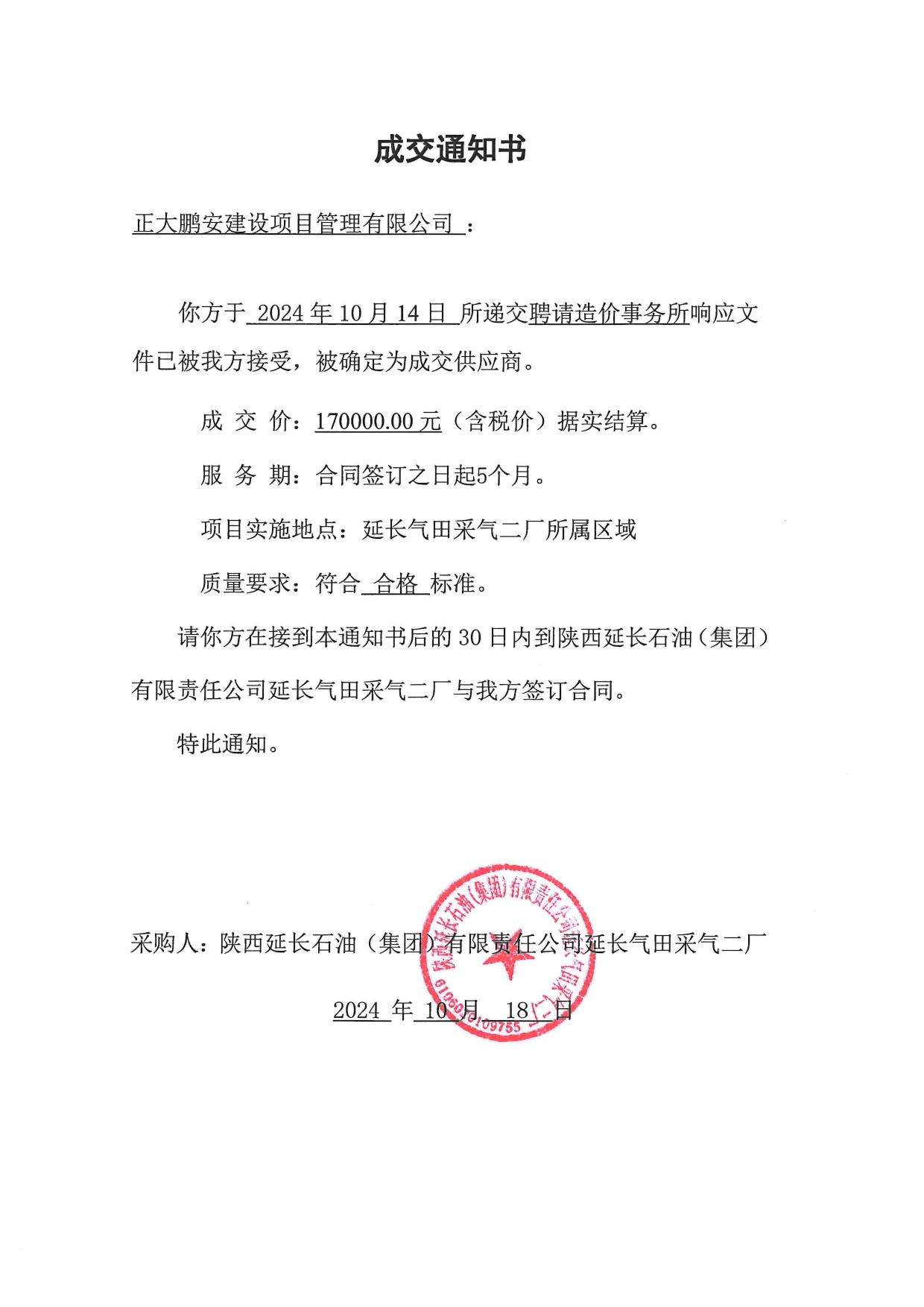 2024年10月14日,經(jīng)評(píng)標(biāo)委員會(huì)綜合評(píng)審,招標(biāo)人確認(rèn),正大鵬安建設(shè)項(xiàng)目管理有限公司中標(biāo)延長(zhǎng)氣田采氣二廠聘請(qǐng)?jiān)靸r(jià)事務(wù)所項(xiàng)目。