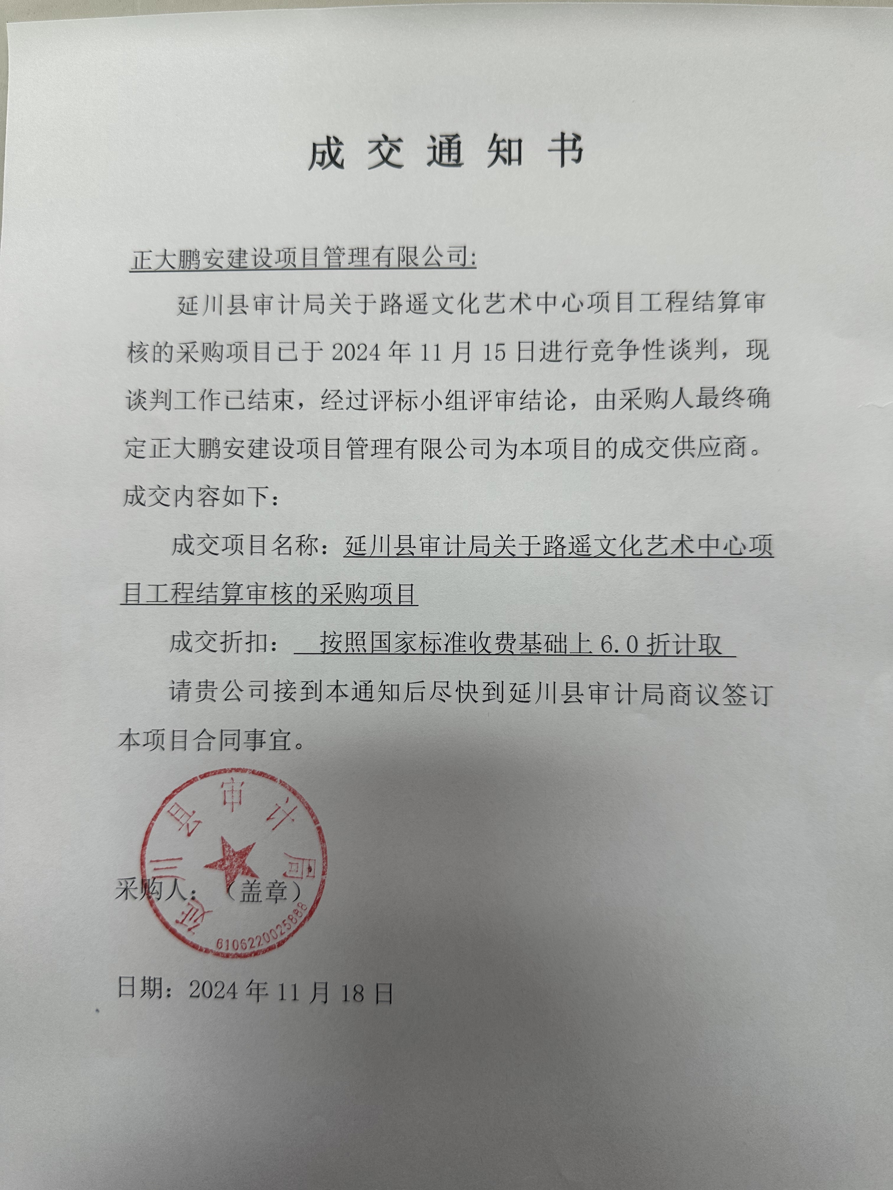 2024年11月15日,經(jīng)評(píng)標(biāo)委員會(huì)綜合評(píng)審,招標(biāo)人確認(rèn),正大鵬安建設(shè)項(xiàng)目管理有限公司中標(biāo)延川縣審計(jì)局關(guān)于路遙文化藝術(shù)中心項(xiàng)目工程結(jié)算審核采購(gòu)項(xiàng)目。