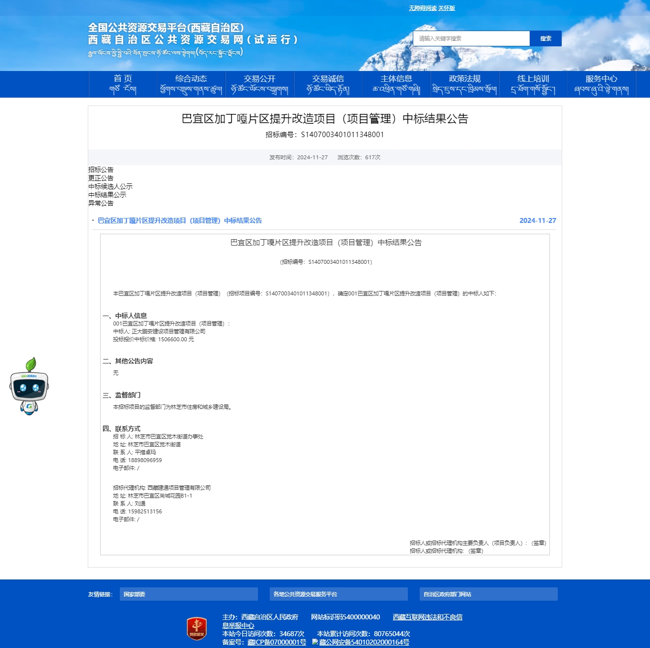 2024年11月27日,經評標委員會綜合評審,招標人確認,正大鵬安公司中標林芝市巴宜區(qū)加丁嘎片區(qū)提升改造項目(項目管理)。