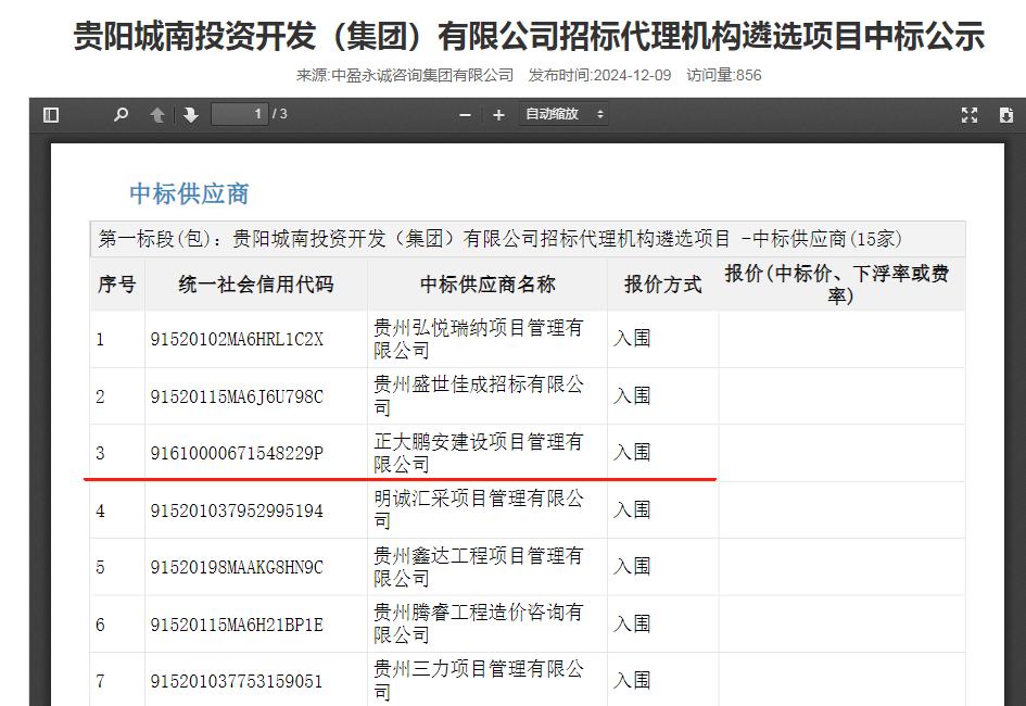 2024年12月9日,經(jīng)評標委員會綜合評審,招標人確認,正大鵬安建設(shè)項目管理有限公司入圍貴陽城南投資開發(fā)(集團)有限公司招標代理機構(gòu)遴選項目。