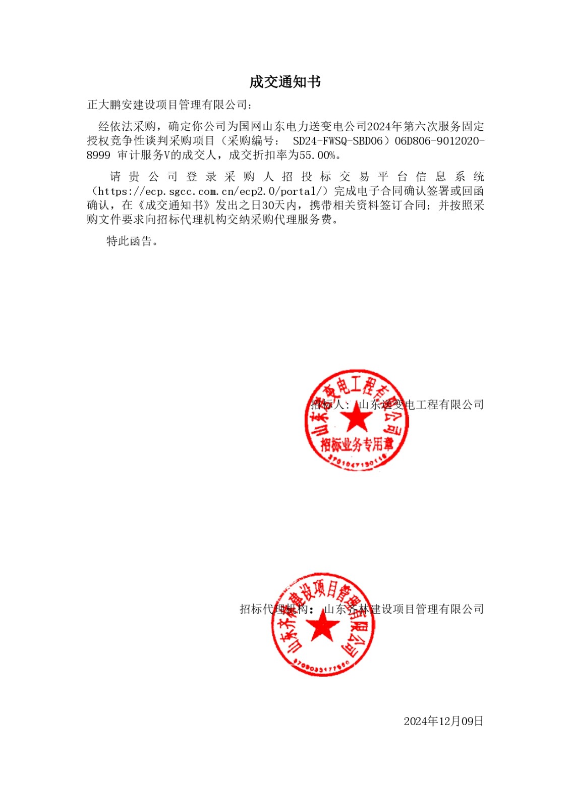 2024年12月9日,經(jīng)評標(biāo)委員會綜合評審,招標(biāo)人確認,正大鵬安建設(shè)項目管理有限公司中標(biāo)“國網(wǎng)山東電力送變電公司2024年第六次服務(wù)固定授權(quán)競爭性談判采購項目(采購編號:SD24-FWSQ-SBD06)06D806-9012020-8999 審計服務(wù)V”。