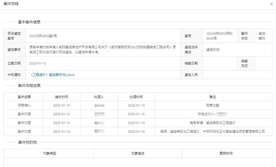 2024年12月30日,經(jīng)咸陽市秦都區(qū)人民法院確認,正大鵬安建設(shè)項目管理有限公司中標“原告南通市深裝裝飾工程有限公司與被告咸陽融麗怡和置業(yè)有限公司、陜西融創(chuàng)璽旭置業(yè)有限公司、咸陽碧潤房地產(chǎn)開發(fā)有限公司關(guān)于精裝修工程合同糾紛一案”造價司法鑒定項目。