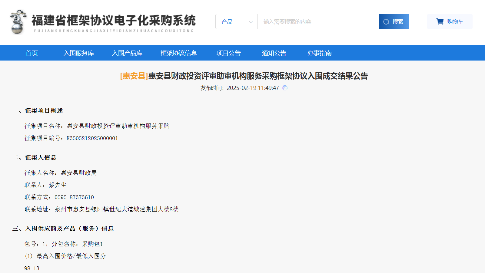 2025年2月19日,經(jīng)評標委員會綜合評審,招標人確認,正大鵬安公司中標惠安縣財政投資評審助審機構服務采購框架協(xié)議。