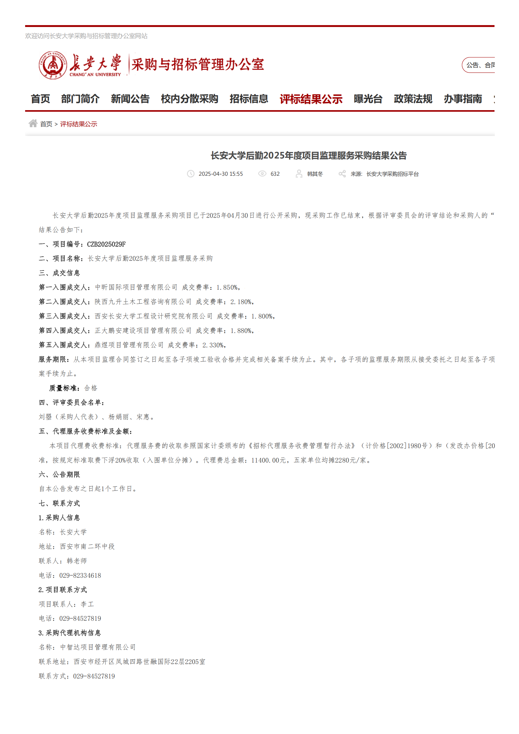 2025年4月30日,經(jīng)評(píng)標(biāo)委員會(huì)綜合評(píng)審,招標(biāo)人確認(rèn),正大鵬安中標(biāo)長(zhǎng)安大學(xué)后勤2025年度項(xiàng)目監(jiān)理服務(wù)采購(gòu)。