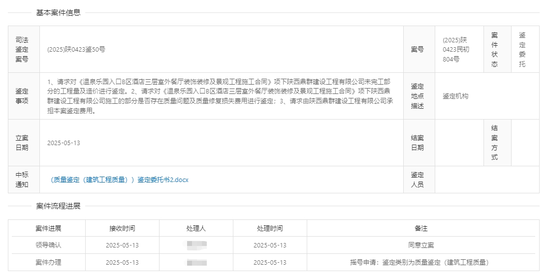 2025年5月13日,經(jīng)涇陽縣人民法院確認(rèn),正大鵬安建設(shè)項目管理有限公司中標(biāo)“原告陜西鼎群建設(shè)工程有限公司與被告陜西樂華恒業(yè)酒店管理有限公司裝飾裝修及景觀工程施工”質(zhì)量司法鑒定項目。