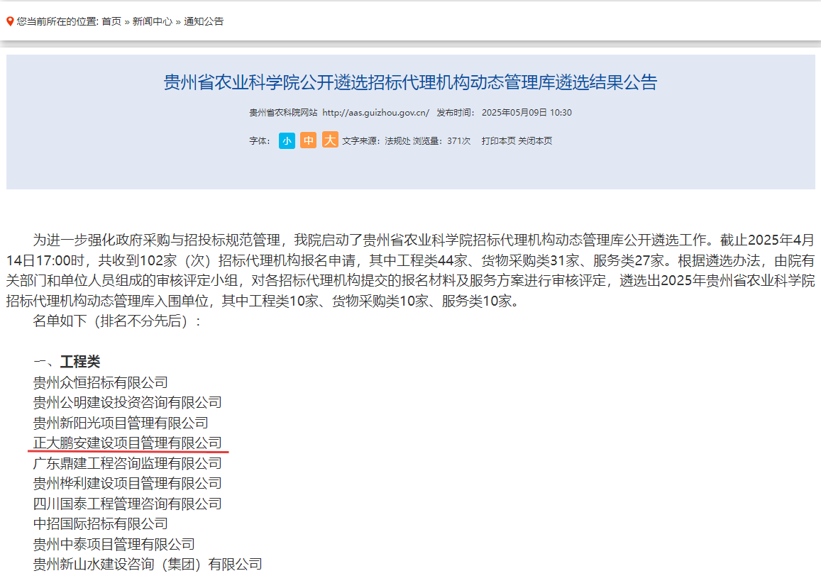 正大鵬安入圍貴州省農(nóng)業(yè)科學(xué)院公開(kāi)遴選招標(biāo)代理機(jī)構(gòu)動(dòng)態(tài)管理庫(kù)遴選項(xiàng)目