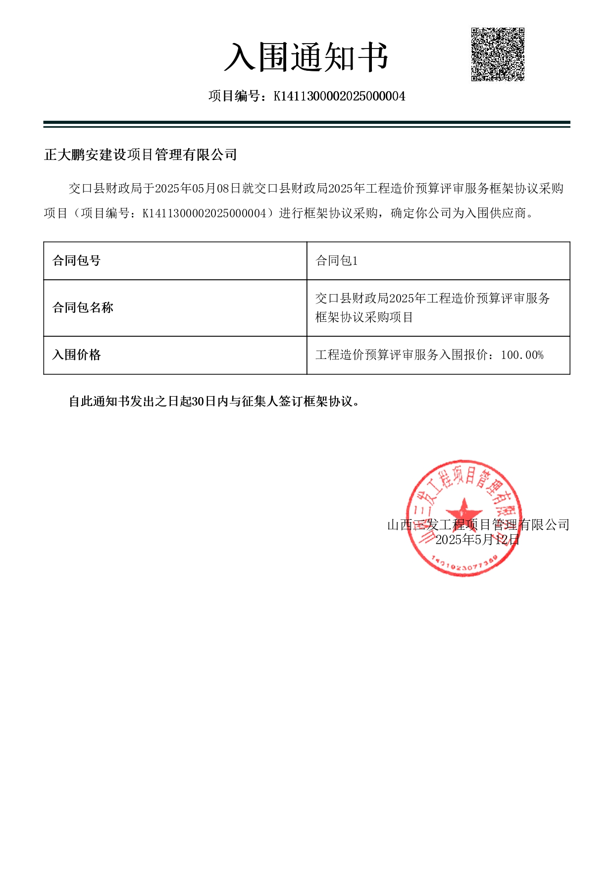 2025年5月12日,經(jīng)評標(biāo)委員會綜合評審,招標(biāo)人確認(rèn),正大鵬安建設(shè)項(xiàng)目管理有限公司入圍山西省交口縣財(cái)政局2025年工程造價(jià)預(yù)算評審服務(wù)框架協(xié)議采購項(xiàng)目。