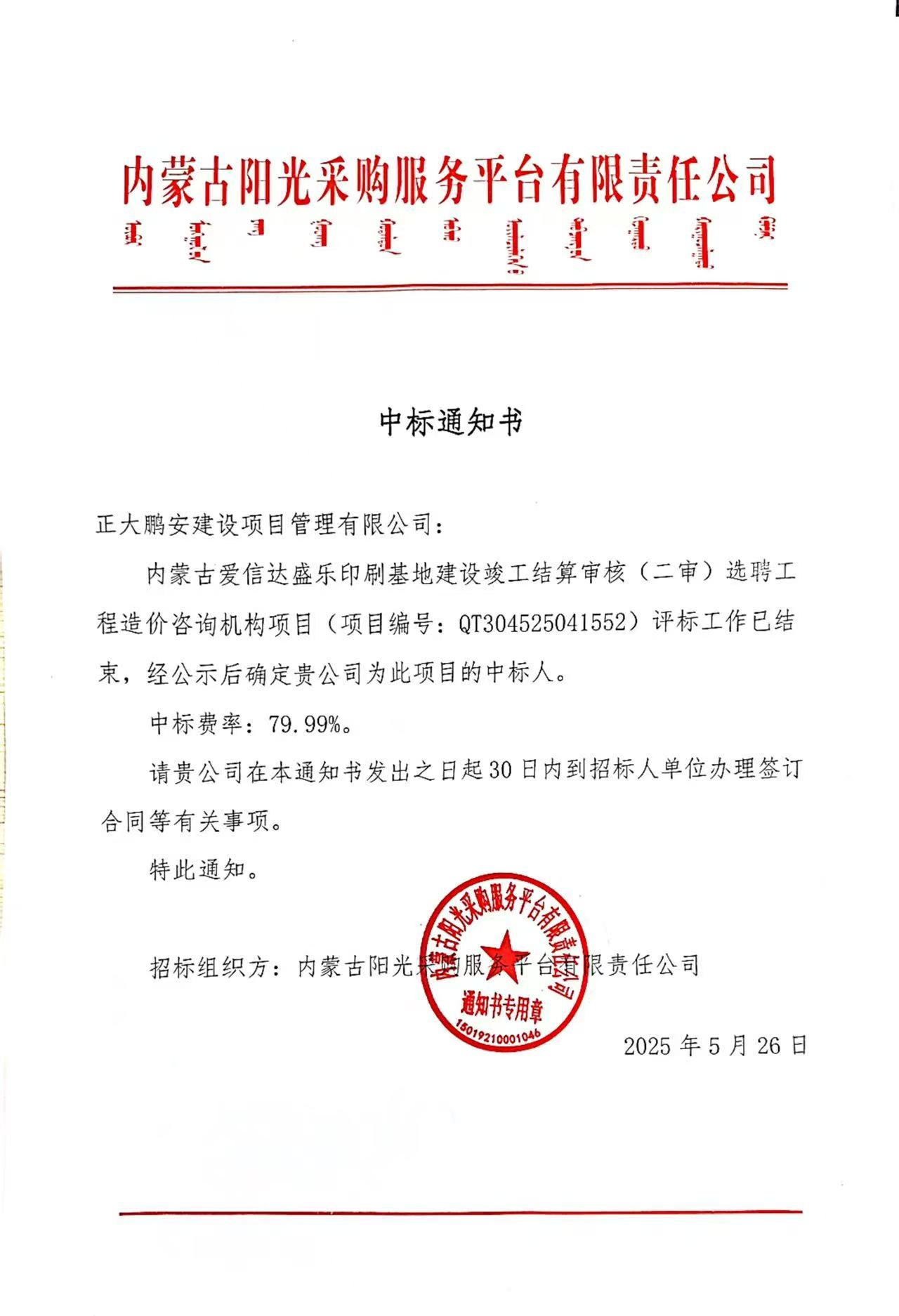 2025年5月26日,經(jīng)評標(biāo)委員會(huì)綜合評審,招標(biāo)人確認(rèn),正大鵬安建設(shè)項(xiàng)目管理有限公司中標(biāo)內(nèi)蒙古愛信達(dá)盛樂印刷基地建設(shè)竣工結(jié)算審核(二審)選聘工程造價(jià)咨詢機(jī)構(gòu)項(xiàng)目。