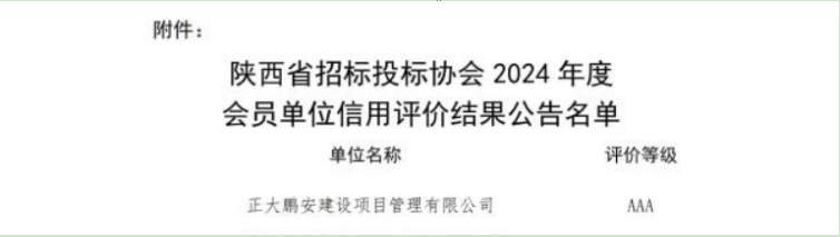 喜報!正大鵬安公司獲評陜西省招標(biāo)投標(biāo)協(xié)會2024年度信用評價最高等級—AAA級企業(yè)