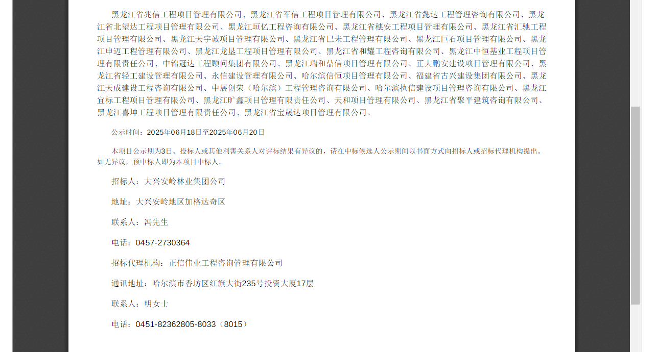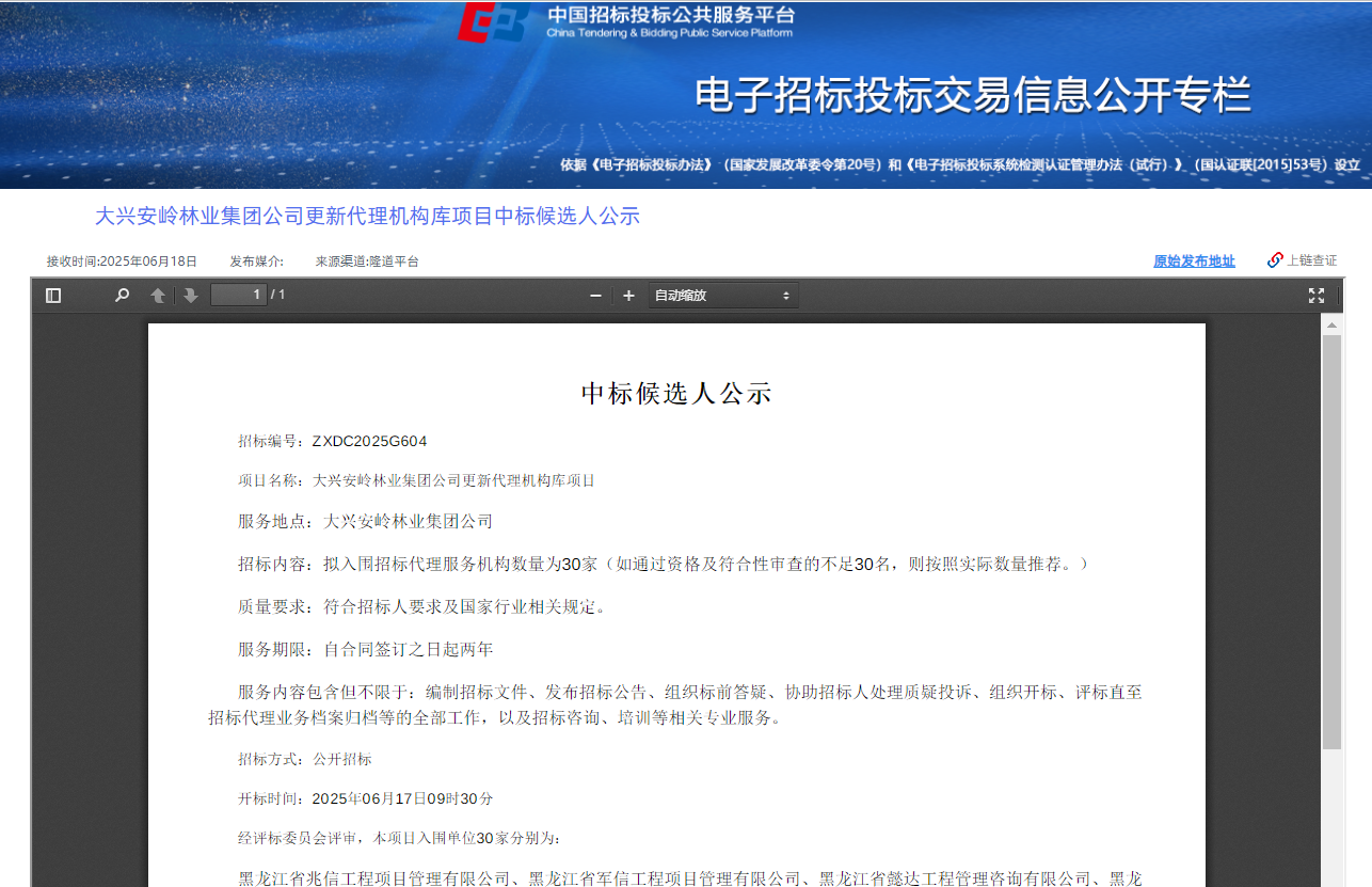 2025年6月18日,經(jīng)評(píng)標(biāo)委員會(huì)綜合評(píng)審,招標(biāo)人確認(rèn),正大鵬安建設(shè)項(xiàng)目管理有限公司入圍大興安嶺林業(yè)集團(tuán)公司更新代理機(jī)構(gòu)庫(kù)項(xiàng)目。