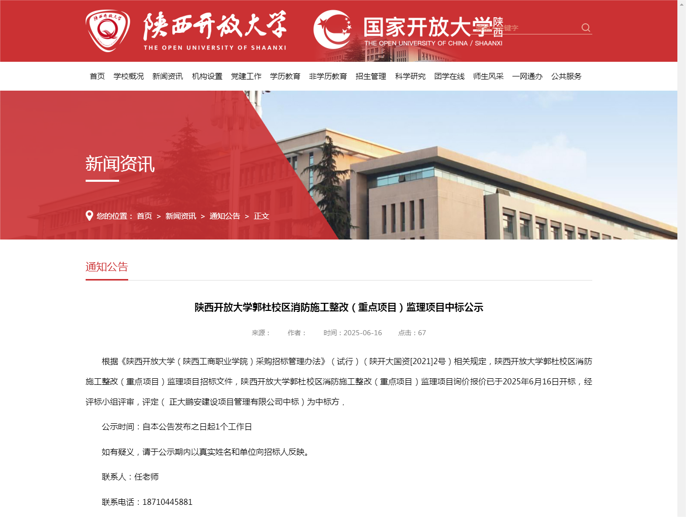 2025年6月16日,經(jīng)評標(biāo)委員會綜合評審,招標(biāo)人確認(rèn),正大鵬安中標(biāo)陜西開放大學(xué)郭杜校區(qū)消防施工整改(重點項目)監(jiān)理項目。