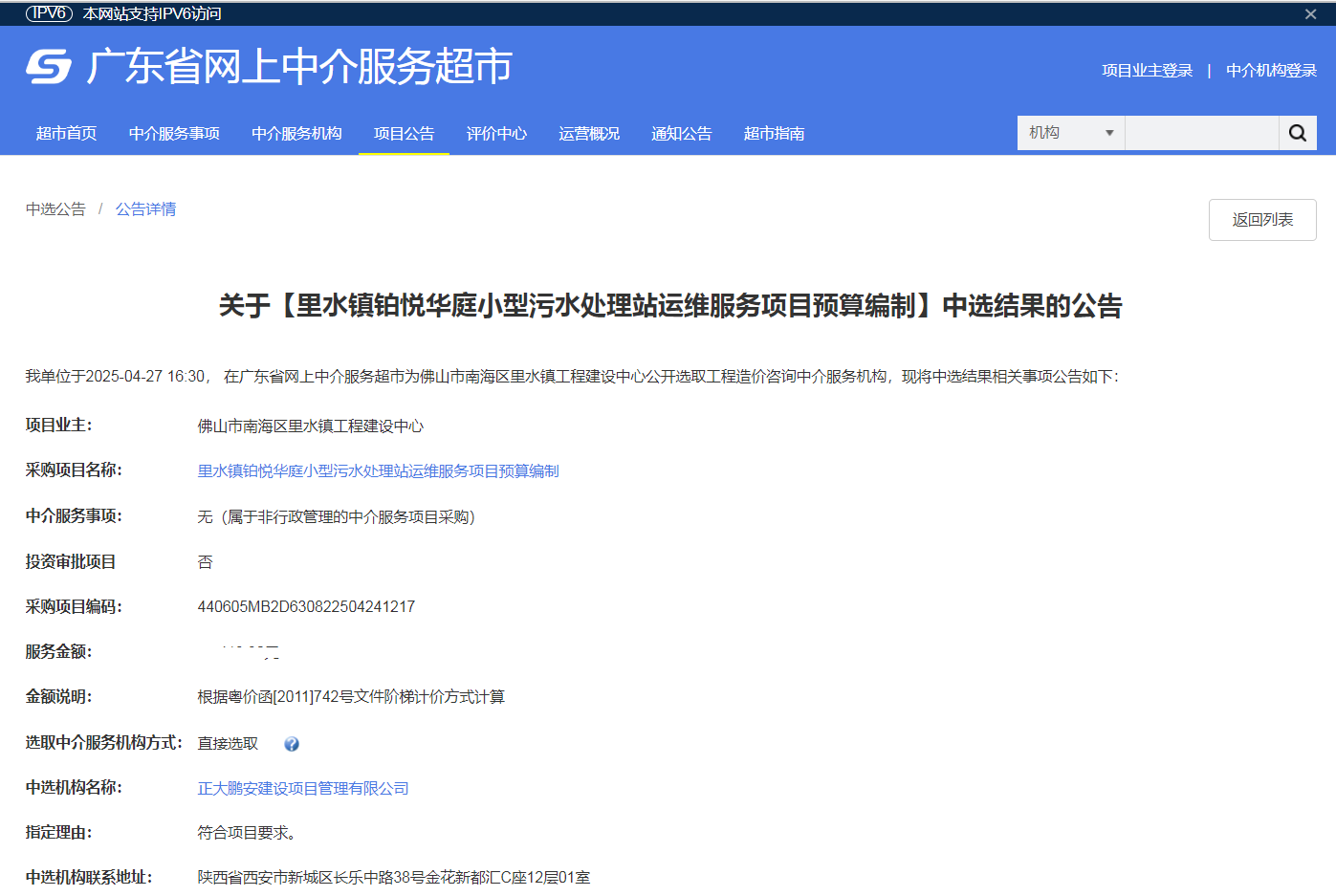2025年4月27日,經(jīng)評標(biāo)委員會綜合評審,招標(biāo)人確認(rèn),正大鵬安建設(shè)項(xiàng)目管理有限公司中標(biāo)里水鎮(zhèn)鉑悅?cè)A庭小型污水處理站運(yùn)維服務(wù)項(xiàng)目預(yù)算編制。