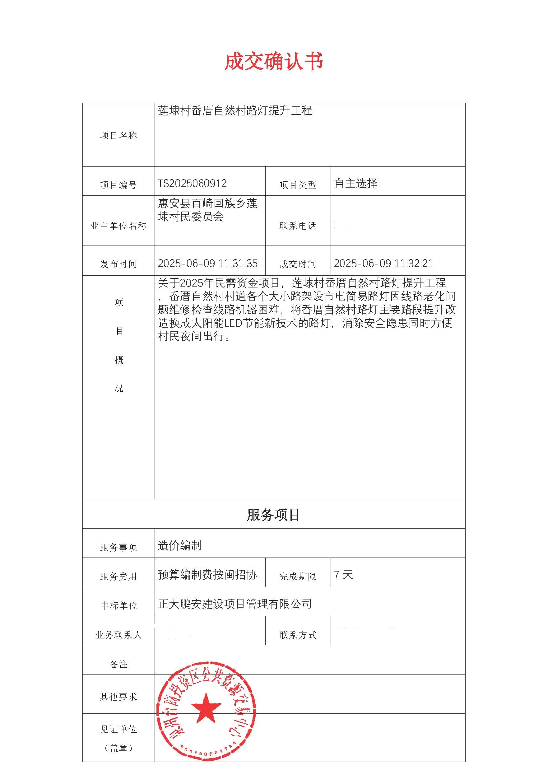 2025年6月9日,經(jīng)評標委員會綜合評審,招標人確認,正大鵬安建設(shè)項目管理有限公司中標福建省泉州市惠安縣蓮埭村岙厝自然村路燈提升工程造價編制。