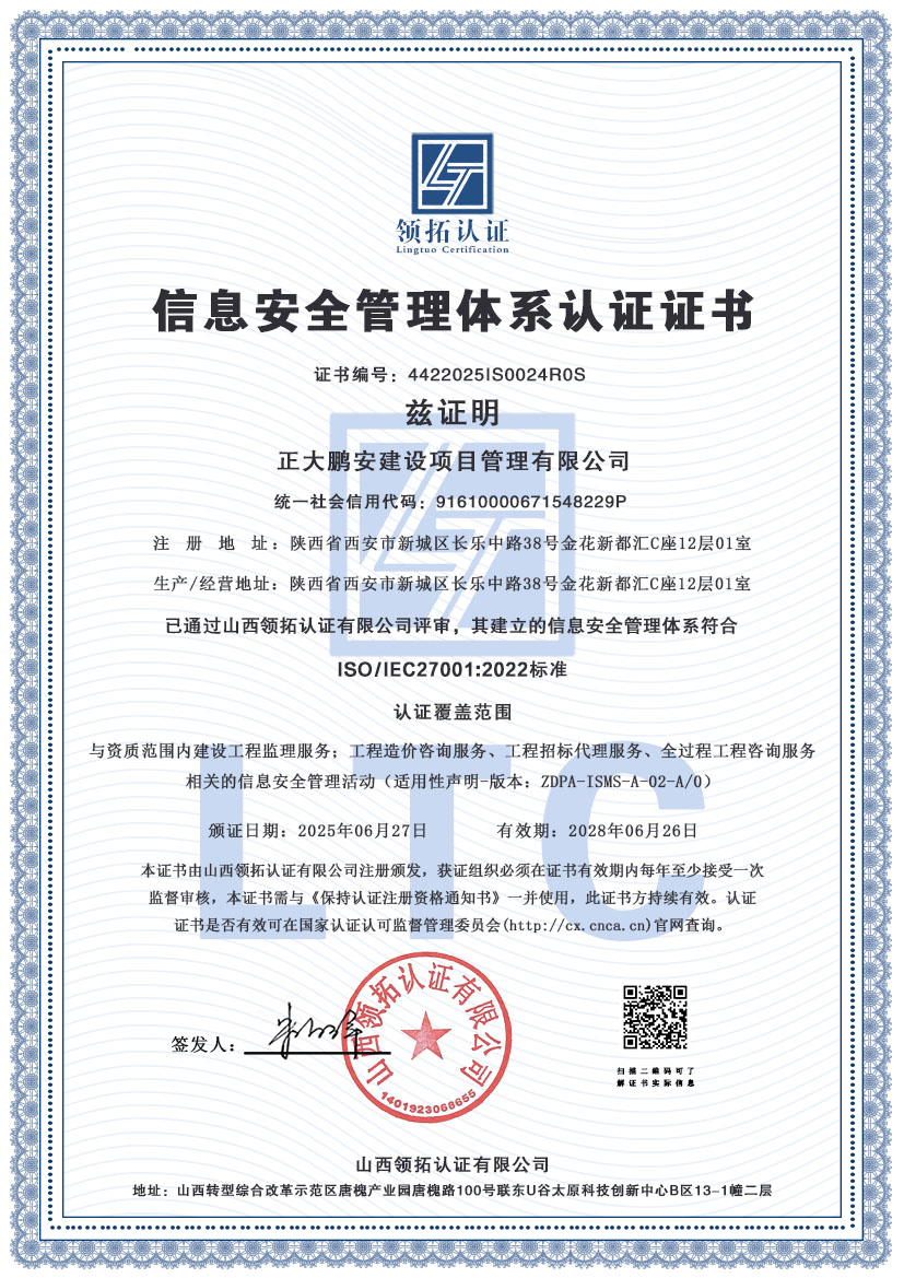 2025年6月30日,正大鵬安公司喜獲信息安全管理體系及知識產(chǎn)權(quán)合規(guī)管理體系雙認(rèn)證,標(biāo)志著公司在規(guī)范化管理和服務(wù)品質(zhì)提升方面取得重大突破。