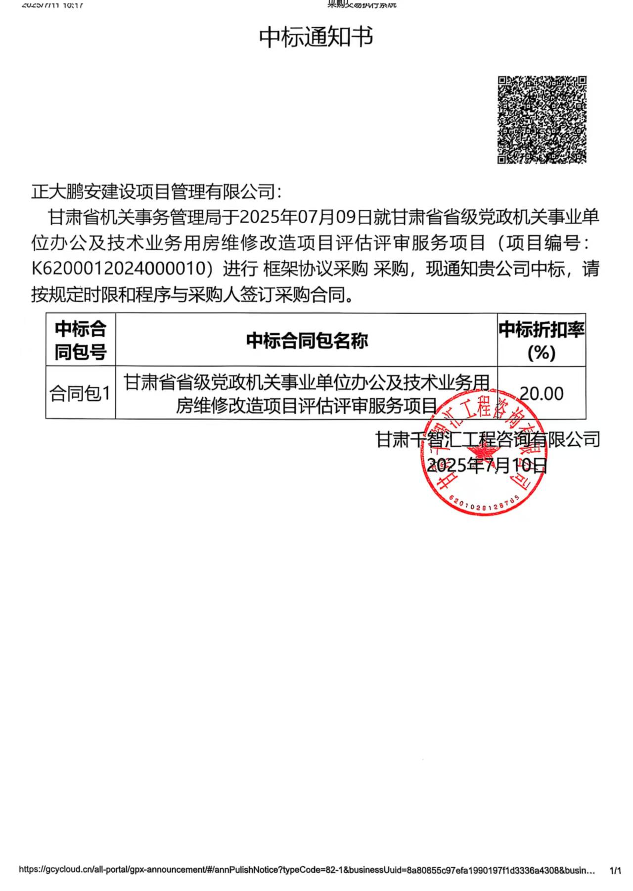 2025年7月10日,經(jīng)評標(biāo)委員會綜合評審,招標(biāo)人確認(rèn),正大鵬安建設(shè)項目管理有限公司中標(biāo)甘肅省省級黨政機關(guān)事業(yè)單位辦公及技術(shù)業(yè)務(wù)用房維修改造項目評估評審服務(wù)項目。